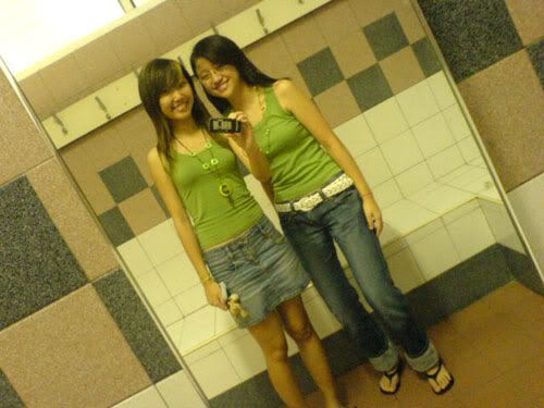 ^ then me and gla too bored. walked tuh squash court there, nobody. hahah! and we went toilet tuh take a full length shot. LOLS! luckily she nv wear skirt and luckily i nv wear jeans ahhs. arbo really like twin. hahah! well. shirts frm different stores though. and i found out today tt i`m alot SHORTER than gladys!!! *grins*