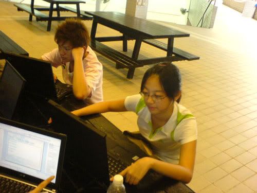 hmm. most of da time was slacking ard and "watching" da ppl play squash. but was halfway falling asleep nahs. very very very tired. then watched jj "showing off" his work. haha` so many no-link photos lahs. esp the one wz and gla one. hahah` cute sias. xD hmm. den for some time, i went up and REALLY CONCENTRATED on doing da project lahs. so rare rights?! haha` but do till almost went crazy. who ask us tuh do last minute work again.. hahah` presenting on like MONDAY lahs. -.-" gonna continue tml. keke`