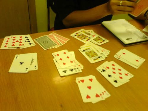 started with speed/split (dunno wad name lah) with gladys. had quite a long game ahh.. i ALMOST lost lahs. but, fan bai wei sheng. muahahss! oh well. then after one game, we tempted uncle tuh play bluff with us. whahah` anw he WASNT studying already also lahs. so pro huh.. cards in da library! whaha`