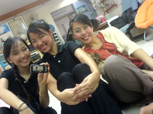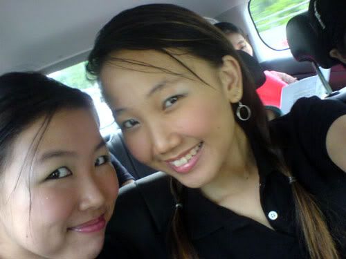 then ftz helped me decide on a.. dunno wad kinda style de hairstyle. two loose loose plaits @ the side one. lols` then we put on our own makeup and ftz helped us touch up and stuff. all looked so funny lahs. xP